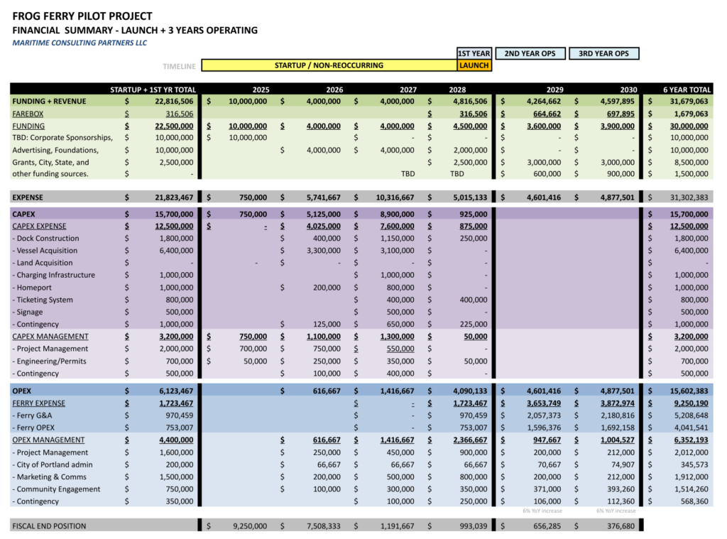 Frog Ferry’s funding strategy is rooted in fiscal responsibility, strategic partnerships, and public-private leverage. The $65 million total project cost is divided into capital and operating components, with funding from local, state, federal, philanthropic, nonprofit, volunteer, and private sources. This approach allowed Frog Ferry to de-risk the pilot phase, demonstrate measurable outcomes, and scale operations through sustainable investment streams.